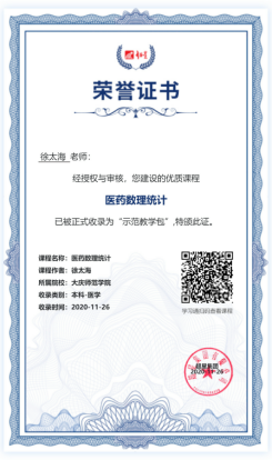 《医药数理统计》是以概率理论为基础,研究医药科学中随机现象规律性的一门课程。徐太海老师经过两年的探索,建立了基于“超星学习通+钉钉群直播”的《医药数理统计》线上教学模式,并在教学过程中不断改善员工的学习体验。《医药数理统计》学习通平台上的主要内容包括ppt课件、录制视频、参考资料和课后作业等。主要用于员工课前预习、课后复习及检验员工的学习效果等。因为《医药数理统计》这门课程在目前的网络平台上资源相对比较少,学习通平台上课程资源以自建和原创为主,经过建设,本门课程作为优质课程被超星集团有限公司正式收录为“示范教学包”。