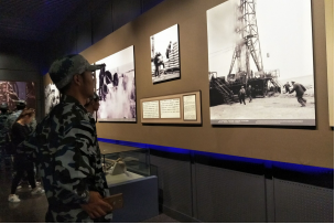 同学们观看铁人照片,感悟铁人精神