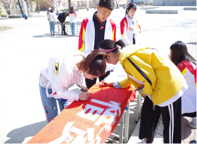 同学们在条幅上签名