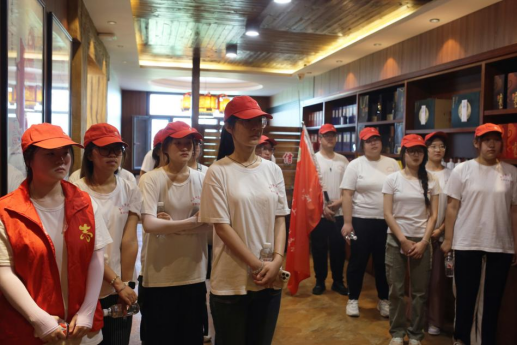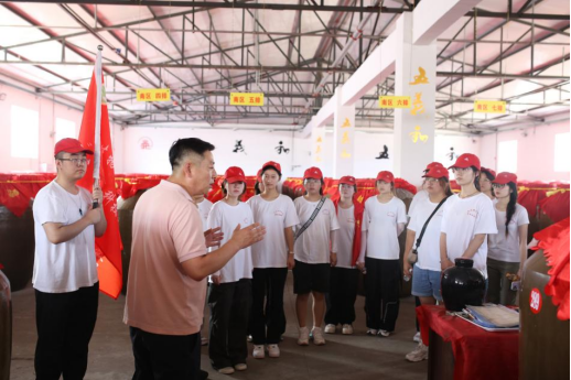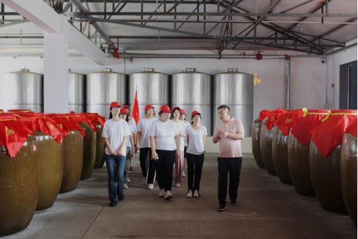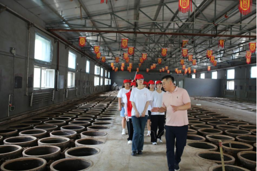 在黑龙江五义和酒业有限公司,团队成员首先参观了产品陈列室,各类产品陈列整齐、包装精美,让同学们感受到了宾县酒文化的源远流长、博大精深。随后在技术人员的带领下,大家了解了从原料选择到成品出厂的整个生产流程,其中包括糟醅、发酵、窖藏、包装等工序,通过参观学习,对酒的产品品牌、产品生产工艺、各阶段的操作流程有了进一步了解。