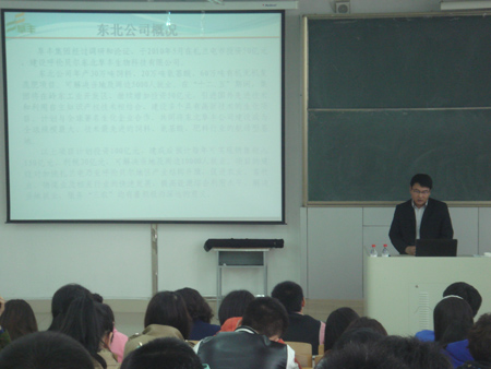 最后,他介绍了东北阜丰公司的发展规模及其销售网络、公司现状、员工发展空间等。段主任还为大家播放了阜丰集团的宣传片,使同学们理解了阜丰集团“让水更清,让天更蓝”的理念;播放了公司在阜丰工作的毕业生李靖宇和订单班员工王瑛顶岗实习的视频。同学们看到了学哥学姐们在阜丰集团的进步,取得的成绩都感到很欣慰,也很渴望加入阜丰集团。段主任的介绍使大家对这个公司产生了敬意,更让大家牢牢的记住了阜丰集团极富特色的企业文化。阜丰集团的发展历程和取得的成就让同学们对集团有了更深的了解,并对阜丰集团产生了很浓厚的兴趣。
