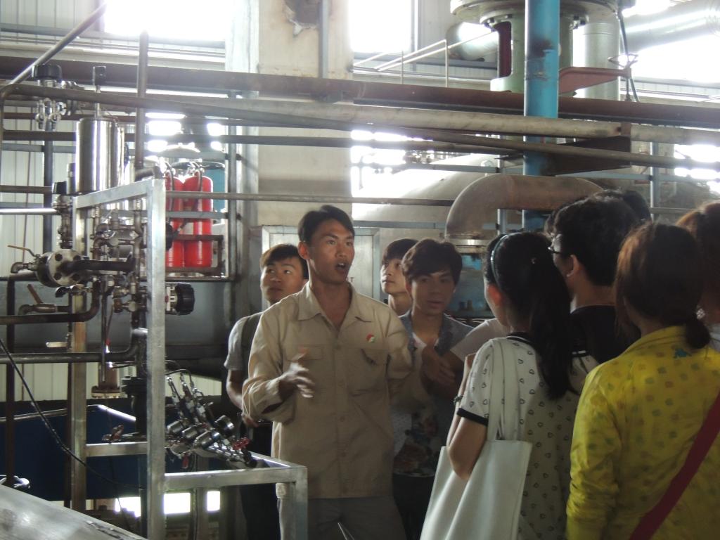 志飞生物化工有限公司公司办公室主任刘莉莉和两位车间技术人员接待了老师和同学们。见习期间,企业技术人员先对同学们进行了安全知识教育,随后带领同学们参观了阿维菌素的发酵车间,讲解了阿维菌素发酵车间的整个工艺流程和设备工作原理,最后又带领大家参观了车间的电脑控制间。